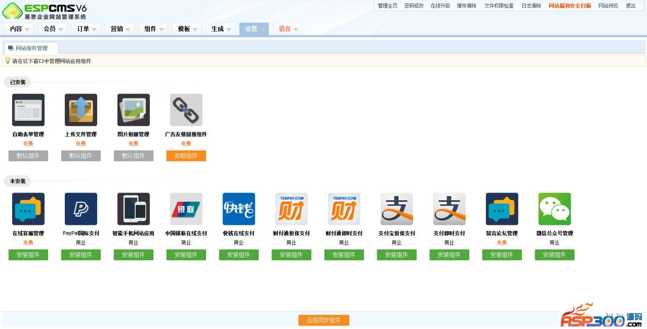 一、自定义组件应用:ESPCMSV6采用了自定义组件安装的方式,可以在线自主安装最新的应用组件,ESPCMS将以组件市场为基础,打造强大实用的组件模式,供用户选择安装使用。