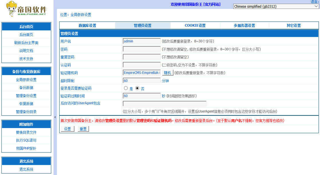 帝国备份王(EmpireBak)是一款完全开源免费,专门为MYSQL大数据的备份与导入而设计的稳定高效软件,系统采用分卷备份与导入,理论上可备份任何大小的数据库。帝国备份王(EmpireBak) 5.1 开源版 更新日志:2016-08-021、新增浏览器USER-AGENT验证功能,只有包含指定信息的浏览器才可以访问后台,也就是说可以指定某一台机器才能访问后台,更高安全性。2、在原来登录安全验证基础上,新增第二重登录验证,变量名和验证字符由系统随机生成,无规律可寻,更高安全性。3、在原来登录安全验证基础上,新增第三重登录验证,验证字符由系统随机生成,并且后台无法查看,必须查看配置文件内容,更高安全性。4、新增验证码过期时间和验证码加密验证,更有效防止暴力提交表单。5、验证码修改为采用点击后显示验证码,更有效的改短验证码过期时间,更有效防止暴力提交表单。6、部分静态页面内容也加登录验证。7、新增第一次设置数据库参数里,自动识别是否支持mysql接口,当不支持时自动识别为mysqli(比如:PHP7运行环境识别),更方便。8、修改密码新增重复密码验证,防止输错,更人性化。9、新增验证配置文件是否引用成功,不成功不执行。10、新增备份表单数量验证,如果超过php本身配置表单最大变量数将会提示。防止表单变量多PHP不识别。11、默认备份目录名增加随机字符。12、在线打包生成文件名增加随机字符。13、提示采用绝对路径引用文件,可以不限目录级别进行提示。