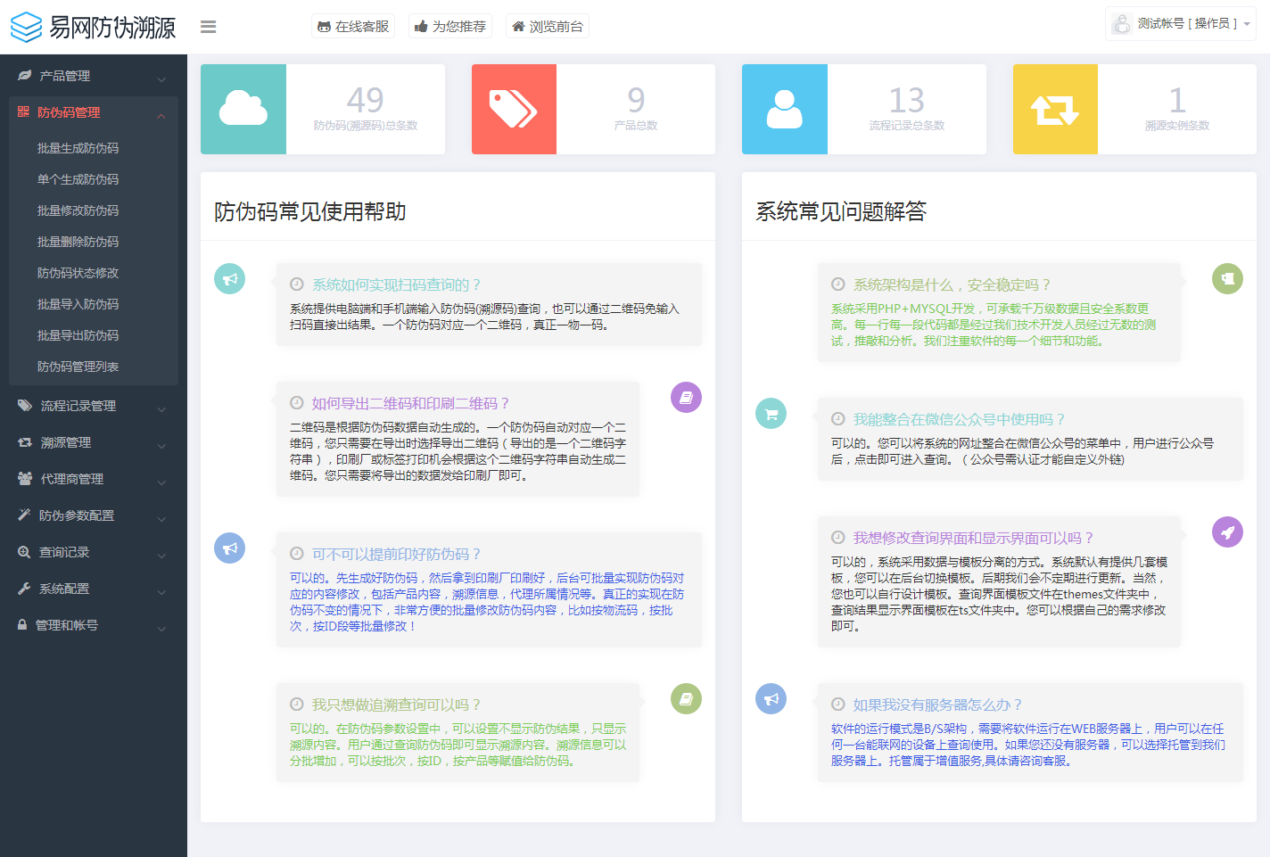 系统由PHP+mysql开发,安全稳定。系统以防伪码(溯源码)为中心,可非常方便的为防伪码赋值产品信息,溯源信息。是建立防伪防窜货和溯源追踪系统的不二选择。