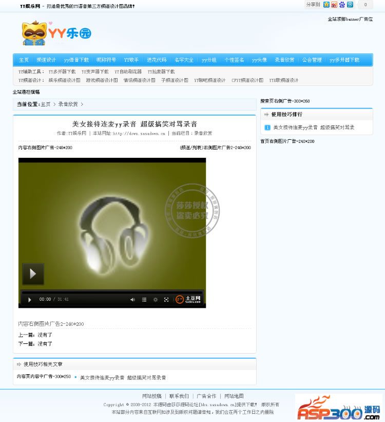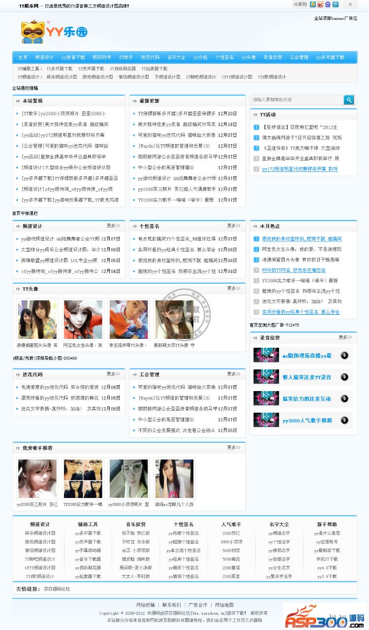 源码说明:此款源码是一个以YY主题的网站,其内容主要是YY频道设计素材,聊天中的发言代码,资料,签名素材,以及频道模板等等,其运营构思主要在于如今YY越来越火,可以说对于玩游戏的人来说YY是个必不可少的东西。虽然比不上QQ如此普及,但绝对也可以说的上如日中天!但是QQ主题网站多不胜数,YY的好像还并不是太多吧。也就是说竞争力度不是太强。所以做起来还是非常赚钱的。