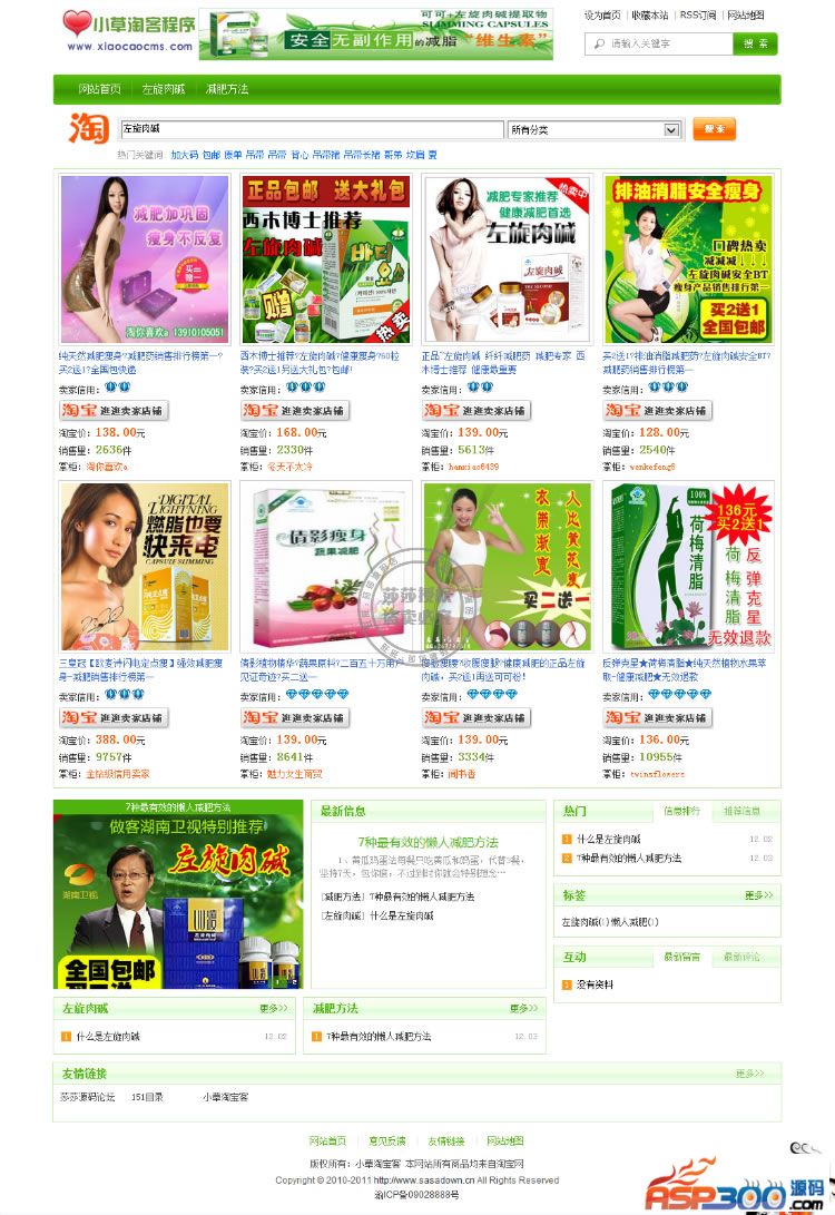 其他说明:减肥排行榜淘宝客模板小草淘客商业版程序系统,一款简单的淘宝客程序系统,模板是我哇减肥网的模板,绿色风格,非常漂亮。程序采用asp+access为系统何核心,无需安装,直接上传到asp空间即可进入后台管理,后台简单易懂,操作绝对符合新手建站标准,只要你认识字,那怕完全没有建站知识,操作也绝对没问题。支持一键更换PID,网站自带了文章发布系统,增加用户体验度,加强商品引导性和用户互动性,并且商品链接采用动态跳转,隐藏原始地址,这样便于搜索排名的SEO优化,符合搜索引擎优化标准。