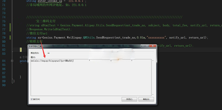 Genius.Payment.WeiXinpay.QRUtils.SendRequest(out_trade_no,0.01m,”xxxxxxxxxx”, notify_url, return_url);