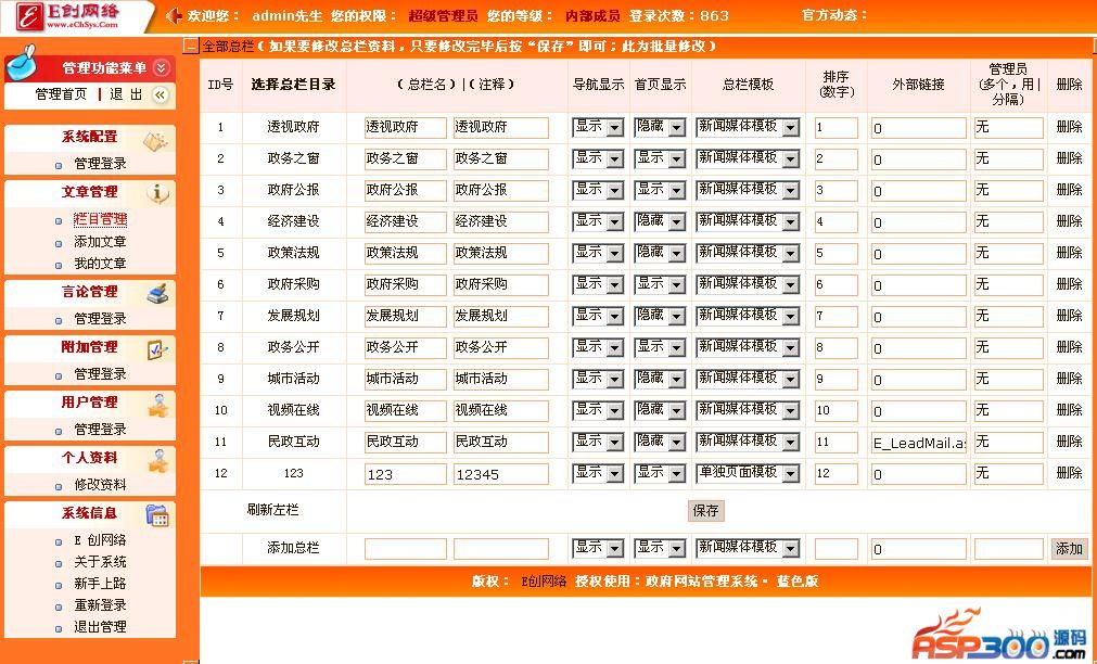 ②文章管理:1、 栏目管理(可任意设置栏目名称、类别、选择栏目模版、设置管理员等等相关属性) 2、添加文章(可添加附件、上传图片、视频、音频、动画、选择相应模版等等,详细请看演示) 3、管理我的文章。