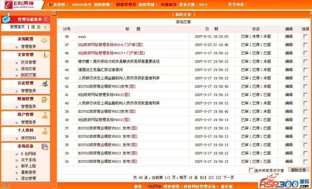 ④附加管理:1、文章审核 2、文章检索 3、 专题管理 4、投票管理 5、公告管理6、友情链接 7、广告管理 8、附件管理9、备份压缩10、服务器探测。