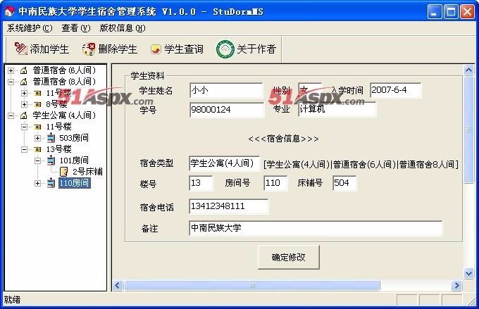 五大模块实现了、管理员信息管理、宿舍信息、学生信息及入住、宿舍