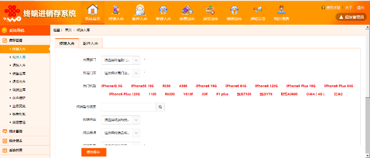 1、库存管理:终端入库、配件入库、调拨入库、销售出库、调拨出库、退货出库、调拨申请信息、在库维护、业务变更、销售扎帐、报废管理。
