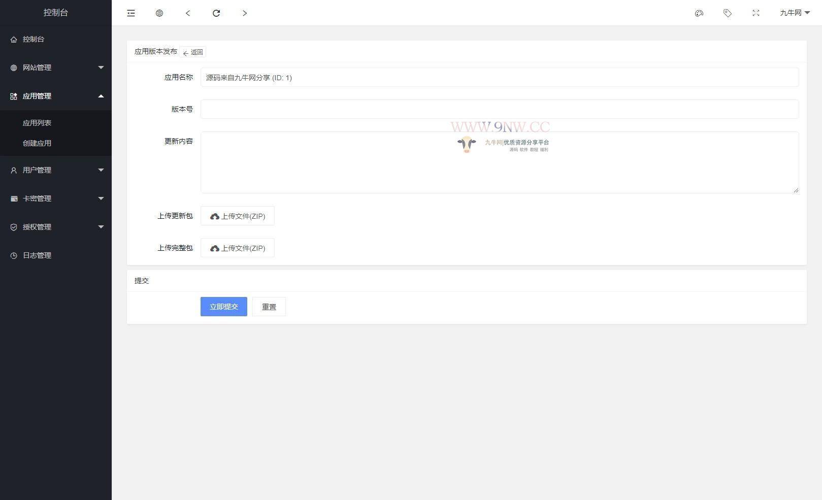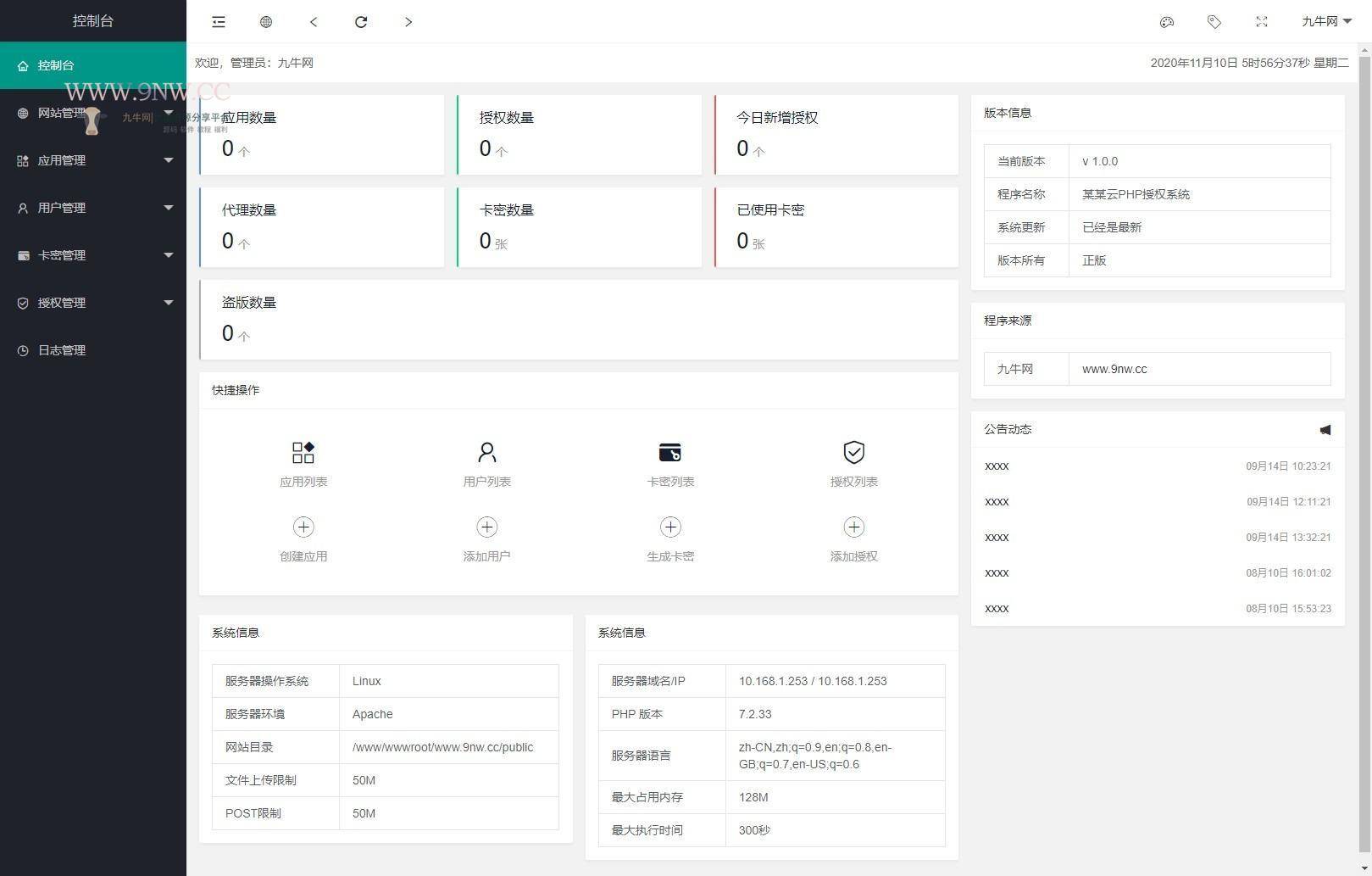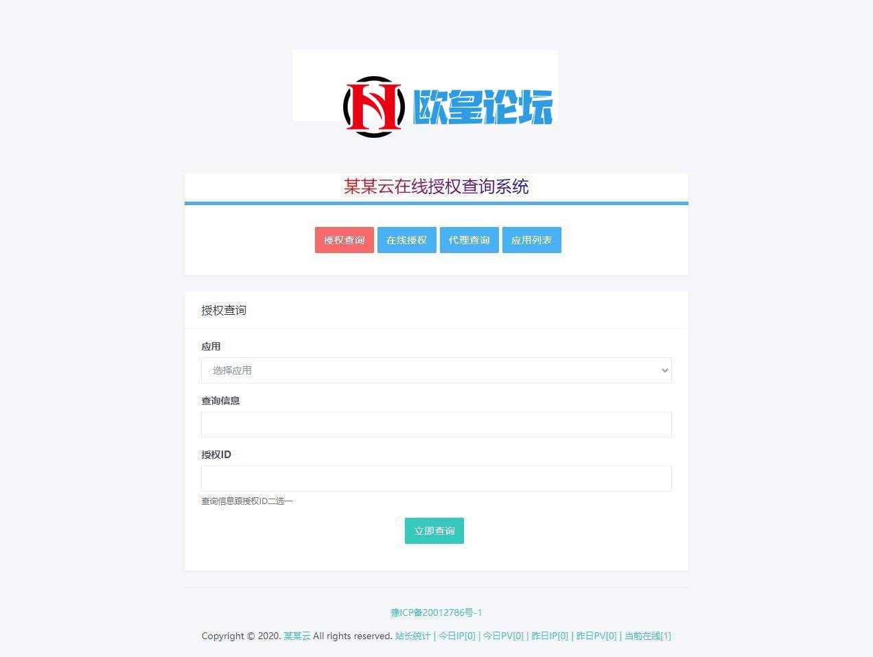 前台支持授权查询,卡密在线授权,代理查询,一级应用列表;