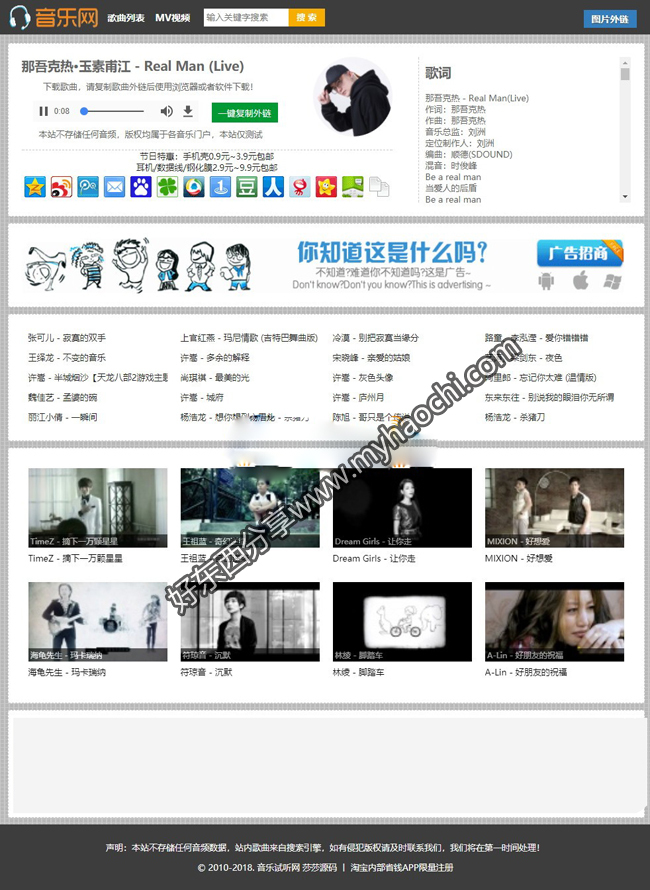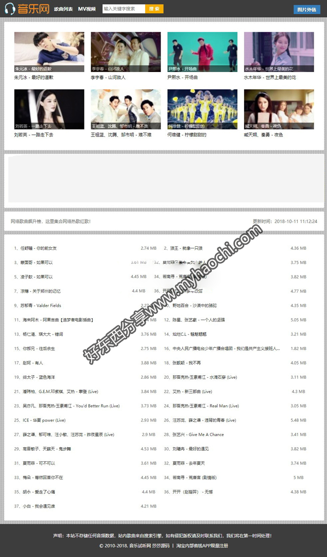 一款非常不错的在线音乐/MV下载站源码,全自动更新,啥也不用打理,莎莎独家修复二维码显示问题,去掉后门,单文件全开源,大家可以随意二开,喜欢的就下啦。