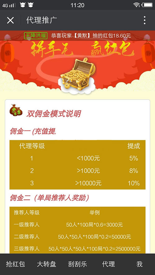 4、代理佣金可自动或人工结算,佣金比例后台可调,可分等级,可扣量。
