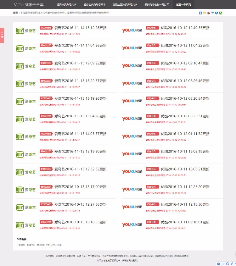 爱奇艺优酷迅雷账号分享,自带自动采集帐号共享,无需人工更新内容程序使用PHP+Mysql