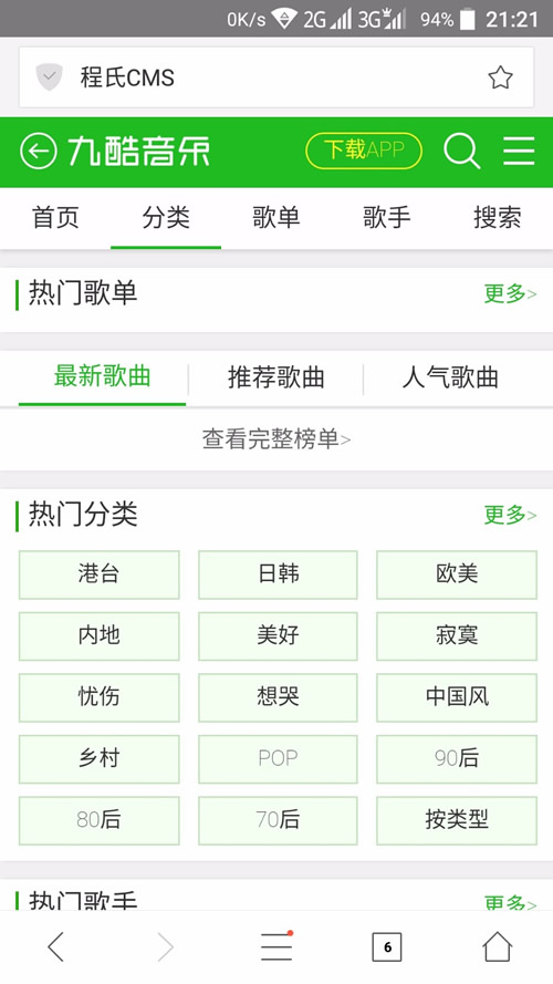 最新CSCMSV4.0 九酷音乐手机模版源码分享,程氏CMS仿9ku音乐WAP手机版模板源码下载,比较好看的一个手机模版,非常完整喜欢的可以买下来。安装说明:在线安装,板块补丁下载好以后选择对应的编码,解压后替换到网站的根目录,上网站后台把手机的默认模版,以及音乐手机和歌手板块的手机模版,同样更换成9ku手机模版。