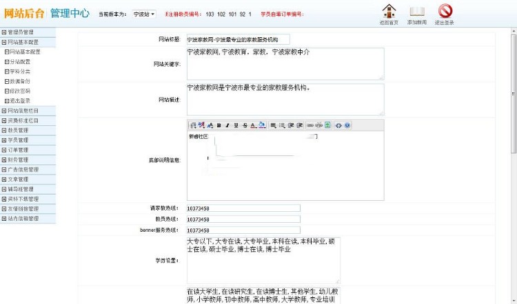 家教网使用说明:网站安装完整后,后台的分站设置宁波站是演示站千万不要删掉,你可以在你分站设置后面加个英文都好,城市名称.就行。
