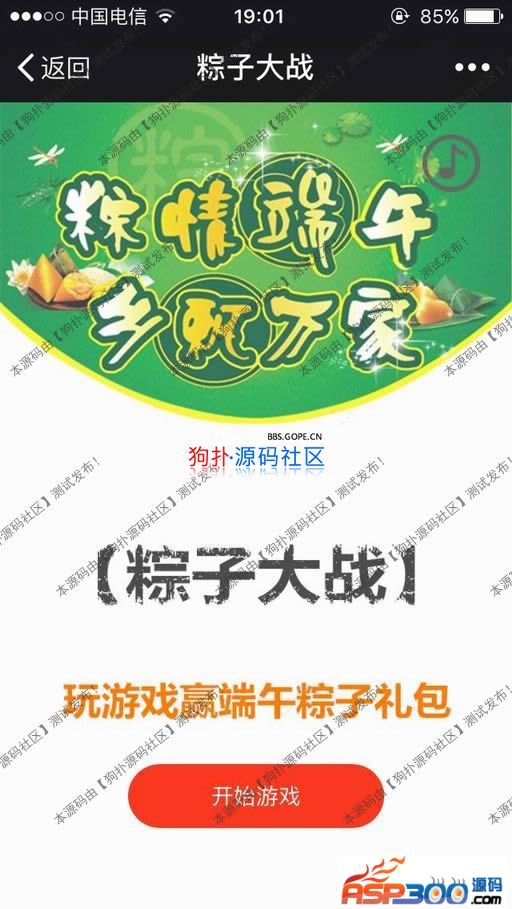 其他说明:端午节粽子大战源码,非常好玩儿的粽子大战微信小游戏!有积分排行,可分享到朋友圈!端午节营销活动吸粉必备!源码上传到服务器即可使用,没有asp、php环境限制,无需数据库支持!