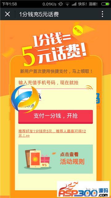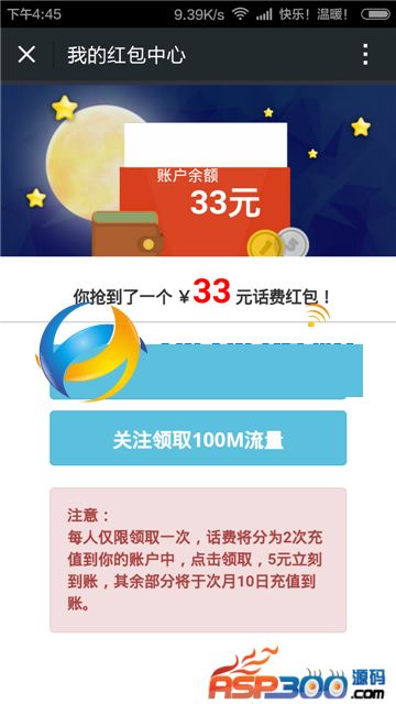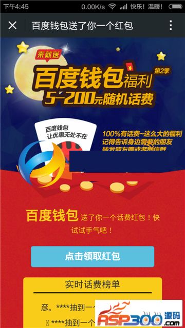 其他说明:分享朋友圈领红包源码|百度钱包领话费源码,吸粉神器+分享后跳转+赚钱神器。最近十分流行的活动源码。UI界面啥的大家可以自己修改修改!至于怎么用,相信大家都懂的,请自己揣摩!一切诱导分享活动都有风险,如果被大量用户举报封号,别来找我哦!慎用!只提供源码供大家研究学习。
