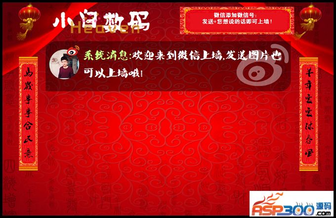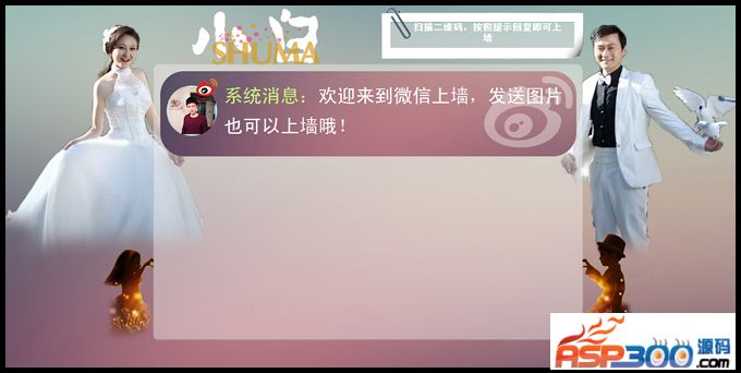 微信墙又称微信大屏幕,是在展会、音乐会、婚礼现场等场所展示特定主题微博的大屏幕,大屏幕上可以同步显示现场参与者发送的微信,使场内外观众能够第一时间传递和获取现场信息,增强现场互动体验。微信墙可为您的微信公众账号快速涨粉儿。微信大屏幕上展示的是您自己的微信公众账号,参与上墙互动需要关注您设置的官方微信账号,可以快速为您的官方微信增涨粉丝,同时也保证了粉丝的质量和后续内容的推送。折翼天使资源社区独家发布的微信墙为最新源码版,所有源码全部开源,域名限制已经去掉,直接拿来就能使用,新版可以完美显示大头像,微信表情,以及图片显示,另外新增摇一摇,再加上前面已经很完善的抽奖和图片功能,可以说是目前最强大的微信墙程序,非常适合在婚庆礼仪类的场合使用!