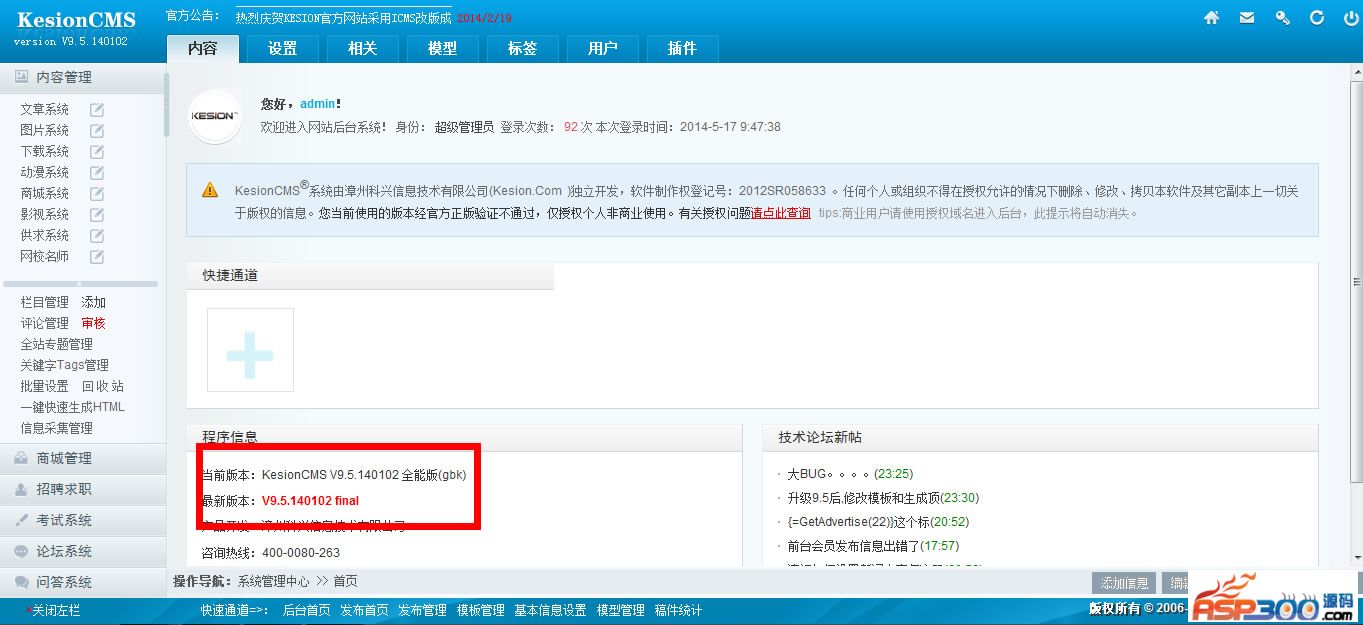 当前版本:KesionCMS V9.5.140102 全能版(gbk)