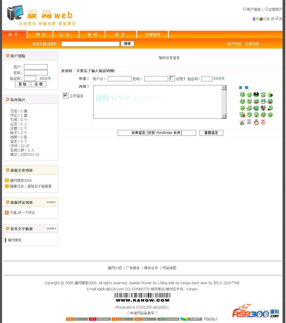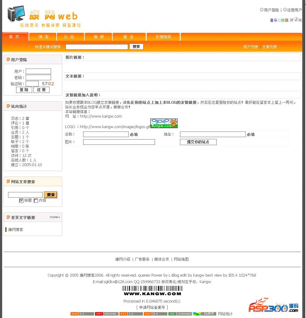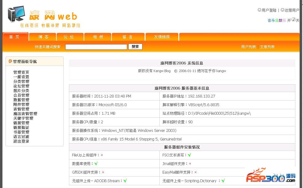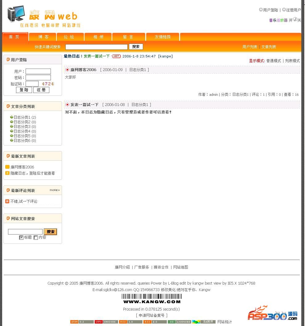 7、后台还是保留L-blog原来简洁的管理(注意:有的空间不允许上传这个admincp.asp文件,请先将它的后缀改为其它格式再上传,然后到空间里再改回asp后缀就行了)