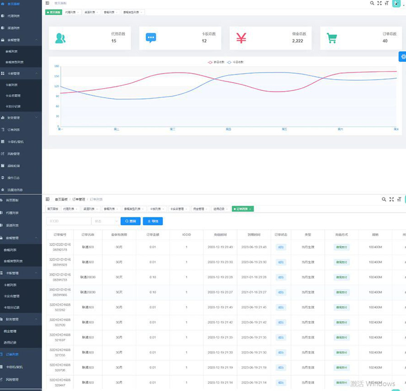 后台功用简介:代理列表办理,渠道列表办理,套餐办理,卡板办理,财务办理,订单列表,