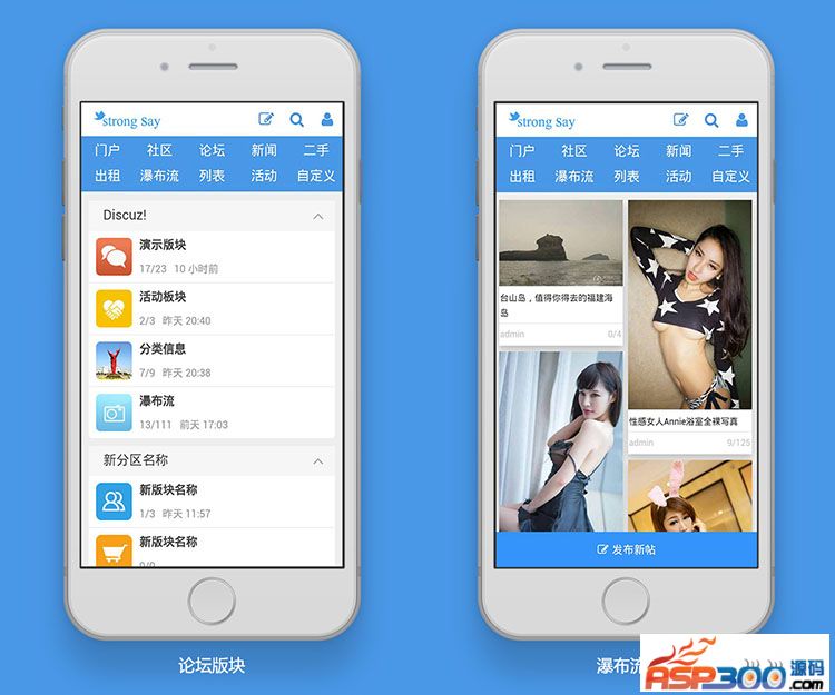 支持帖子列表瀑布流,图片,文字等多种方式排版(后台插件可控制)