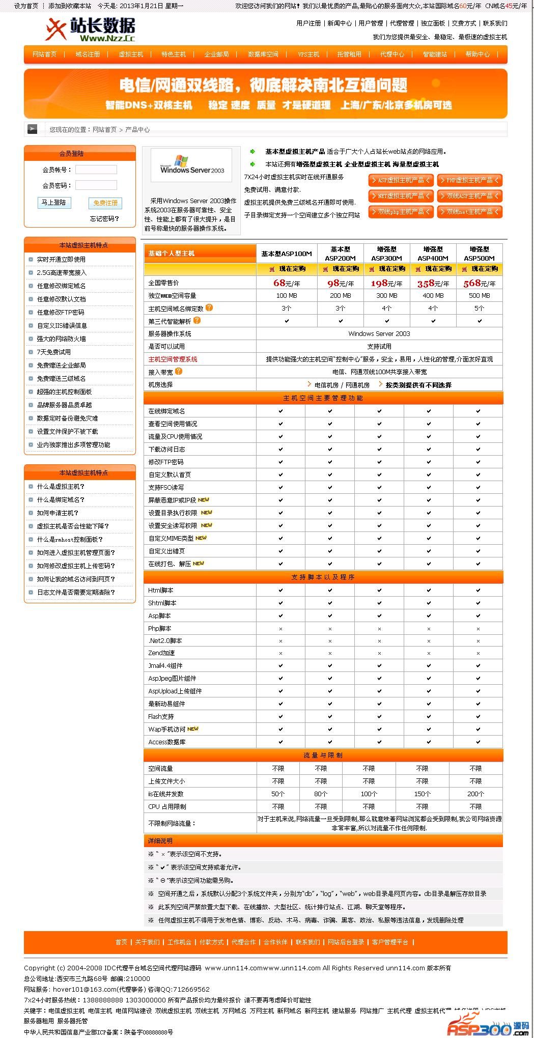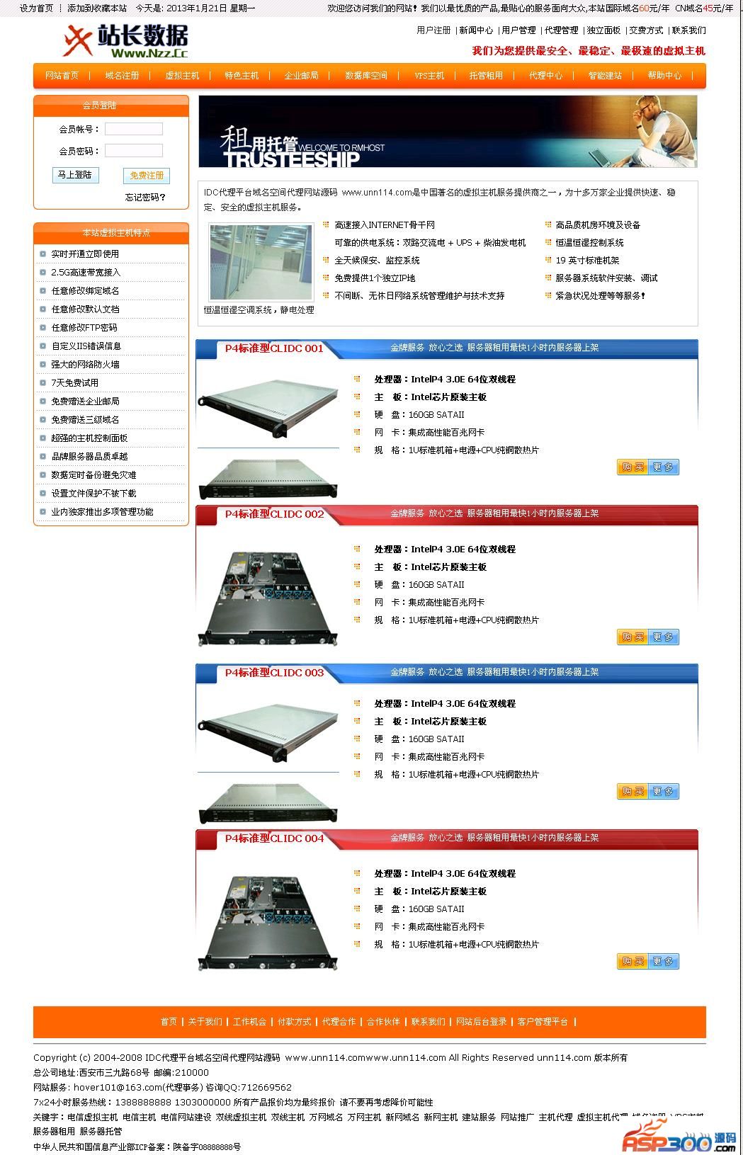 源码介绍:这款IDC虚拟主机网站源码页面设计还是非常不错的,功能上也没有限制,虽然市场上IDC这类源码已经很多了,但114网站源码还是收录了它,大家喜欢的可以下载来调试看看,asp的程序,直接用asp测试软件打开即可。
