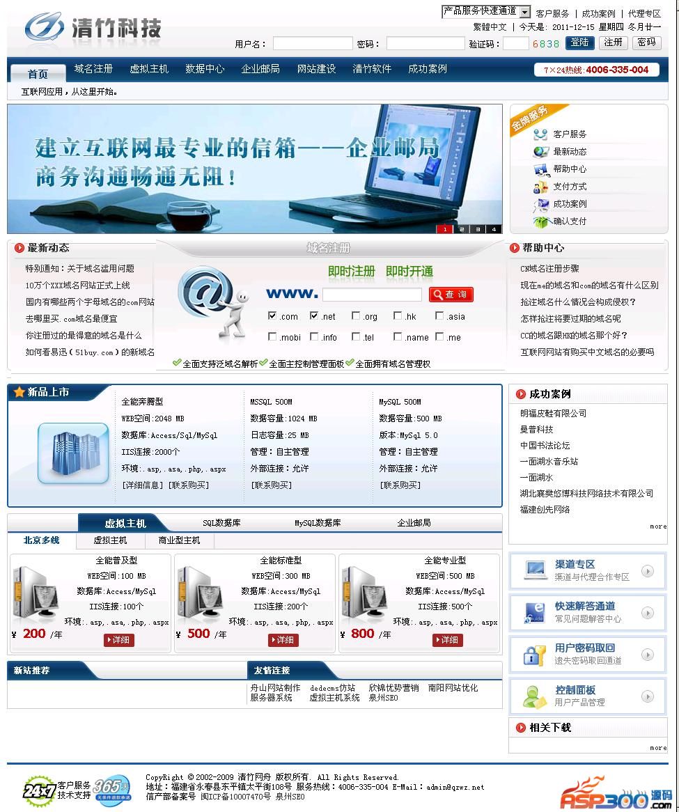 清竹虚拟主机管理系统包含:实时开通主机,主机控制面板在线管理;应用程序池自动分配管理,提升服务器性能;自动分配站点权限,防FSO漏洞重装系统恢复工具,迅速恢复所有站点配置等。·实时开通主机,主机控制面板在线管理·应用程序池自动分配管理,提升服务器性能·自动分配站点权限,防FSO漏洞·网银在线支付,实时入帐·重装系统恢复工具,迅速恢复所有站点配置·免费技术交流、ASP代码开放,支持2次开发·主被控分离,支持一台主机控制多台服务器·开通主机赠送邮局、MSSQL数据库、MYSQL数据库实时开通·实时开通MSSQL数据库、MYSQL数据库、企业邮局·自带代理销售平台,代理可独立开放站点对虚拟主机进行销售·子目录绑定,一台主机绑定多个子目录·支持多用户代理平台,只需绑定域名即可附:重大升级修改功能列表介绍一、 撤销代理时将代理名下的会员归为主站所有,同时将代理帐号下的会员余额清零二、 后台可查看代理的财务记录,三、 修正代理申请页面错误B四、 修正WHOISE信息无法显示问题五、 修正域名查询结果乱码六、 修正域名注册出错七、 修正中国数据接口所有人信息填充错误八、 修正后台域名管理API返回空信息时页面出错B九、 购买主机时价格精确度设为0.00十、 流量信息精确度设置为0.00十一、 修正无法获取日志错误十二、 修正默认模版FLASH遮挡问题十三、 域名提交续费时重复续费问题十四、 升级虚拟主机同时升级其附属产品十五、 其它细微调整