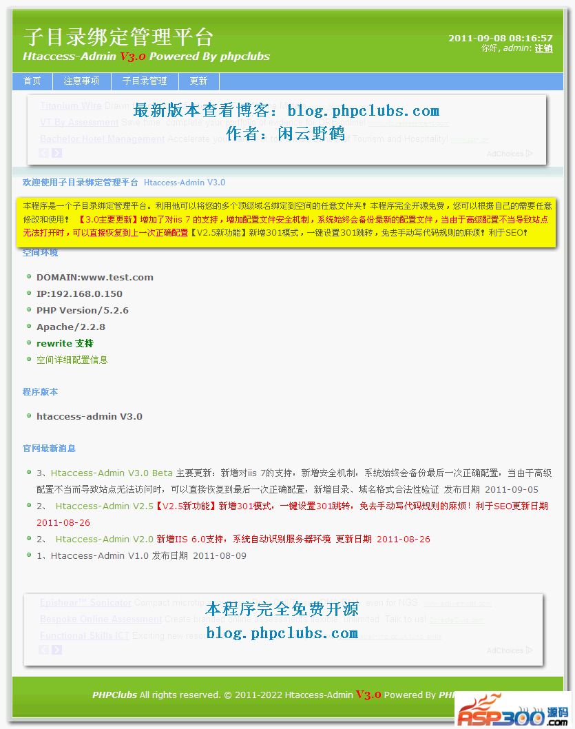 本程序是一个开源的PHP WEB 应用——子目录绑定管理平台。利用他可以将您的多个顶级域名绑定到空间的任意文件夹!本程序完全开源免费,您可以根据自己的需要任意修改和使用! 【3.0主要更新】增加了对iis 7 的支持,增加配置文件安全机制,系统始终会备份最新的配置文件,当由于高级配置不当导致站点无法打开时,可以直接恢复到上一次正确配置【V2.5新功能】新增301模式,一键设置301跳转,免去手动写代码规则的麻烦!利于SEO!