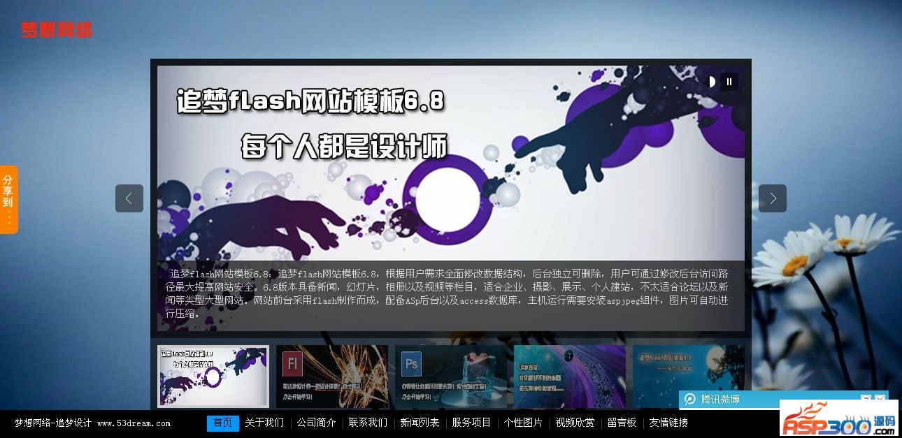 追梦flash网站模板6.8,根据用户需求全面修改数据结构,后台独立可删除,用户可通过修改后台访问路径最大提高网站安全。6.8版本具备新闻,幻灯片,相册以及视频等栏目,适合企业、摄影、展示、个人建站,不太适合论坛以及新闻等类型大型网站。网站前台采用flash制作而成,配备ASp后台以及access数据库,主机运行需要安装aspjpeg组件,图片可自动进行压缩。