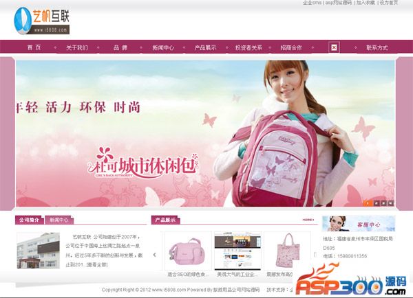 艺帆旅游用品公司网站源码就是以某旅行背包公司网站为蓝图制作的,温馨的粉色基调加上明快的节奏简约大方,很符合大型生产型企业的网站作风。