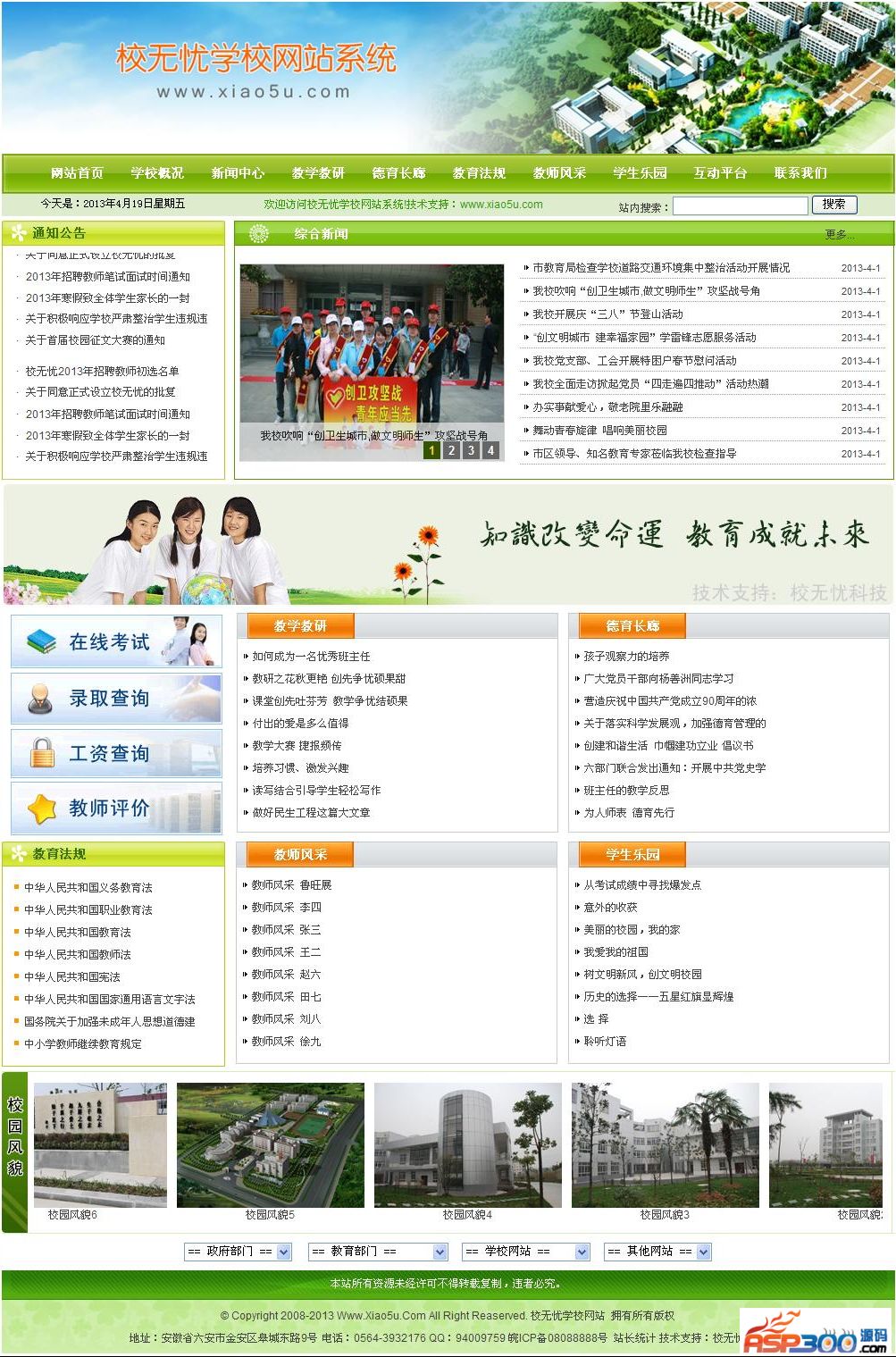 校无忧学校网站系统是一套中、小学通用的学校网站管理系统,采用适合学校的专用网站模版,增强了系统的针对性和易用性。现有学校概况、校园快讯、教学教研、德育长廊、教育法规、教师风采、学生乐园、互动平台、联系方式等栏目……