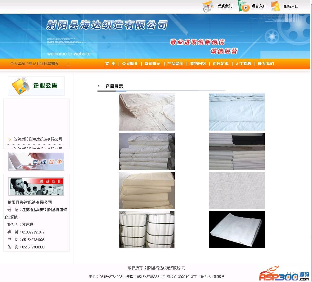 海达织造有限公司网站源码,后台可添加新闻,管理客户订单信息,发布企业招聘信息等。