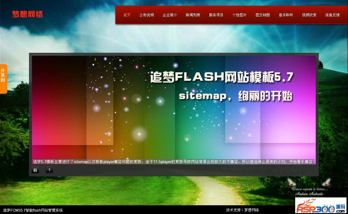 追梦5.7模板主要进行了sitemap以及新版player兼容问题的更新,由于11.5player的更新导致网站背景出现极大的不兼容,所以被迫停止原有的计划,开始着手兼容补丁问题,经过修改后的5.7具有良好的兼容性,背景也调整为自动拉伸模式,取消原有的等比例放大,同时,为了适应百度搜索引擎的新规则,增加了sitemap功能,更有利于flash网站的适应性。