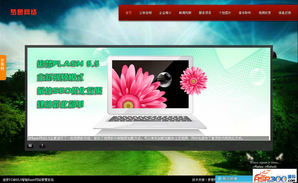 追梦flash网站模板5.5主要进行了一些视频的升级,修改了视频的外部链接加载方式,可以有效加载优酷和土豆视频,同时也修改了首页的代码优化方式,针对内页的一些如新闻,图片等,也加强了一些链接方式,导航中含有的链接会自动加载到首页中成为超链接。相信此次改动会极大的提高视频使用率和优化能力。