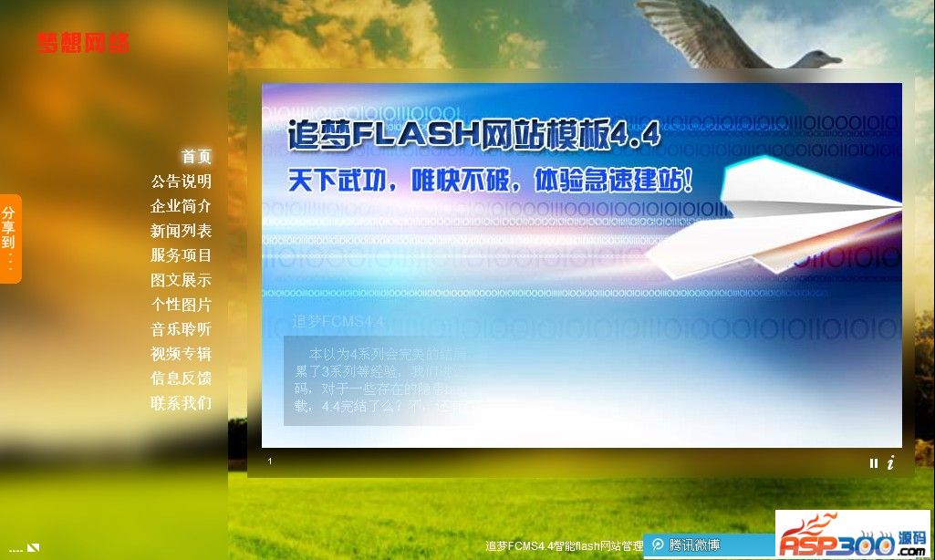 本以为追梦flash网站模板4系列会完美的结局,可是,不好意思,4.4版本来了,这次经过1个多月的修改,并积累了3系列等经验,我们进行了较大的改动,不仅修改了首页中的代码,还修改了大量分页代码,对于一些存在的隐患bug等进行了一次清理,重新编辑了部分xml的属性,让其更有利于加载,4.4完结了么?不,还有后续。。。