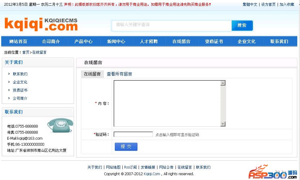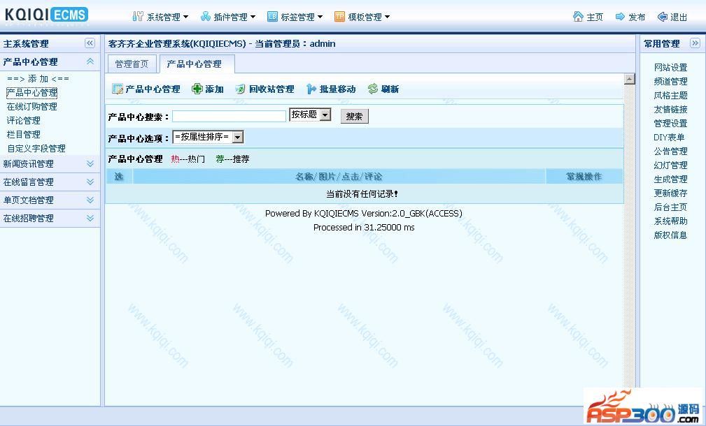 客齐齐企业网站KQIQIECMS基于ASP+Access技术开发的企业内容管理系统。系统主模块:产品,资讯,单页面,招聘,留言。其中产品和资讯支持自定义字段。系统列表页支持动态,伪静态。内容页支持动态,伪静态,生成静态。代码和模板分离,让你更轻松的做网站。