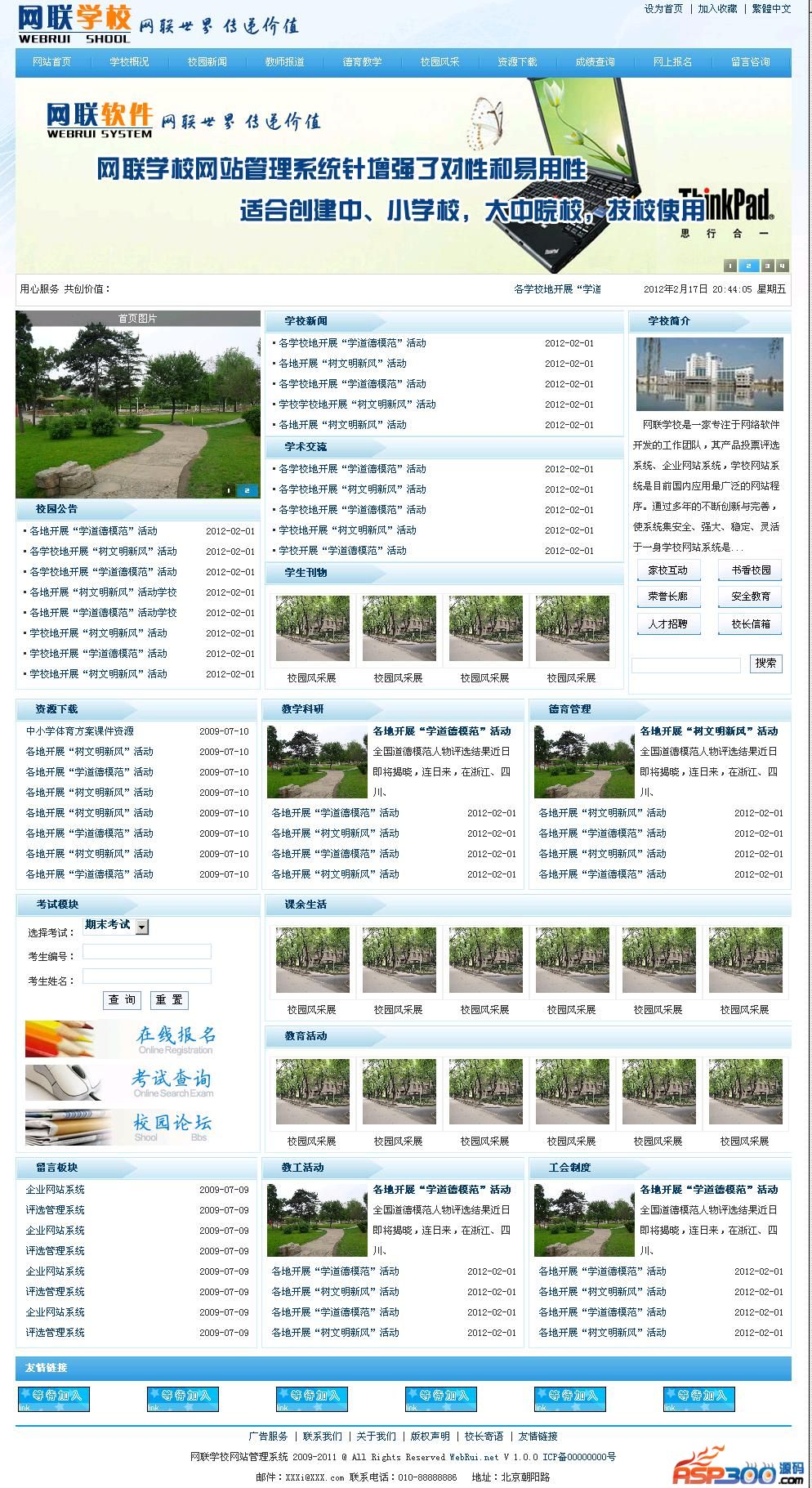 网站首页 学校概况 校园新闻 德育教学 校园风彩 资源下载 求贤纳士 成绩查询 网上报名 联系我们 会员中心 校园信箱等学校网站常用的栏目,采用当前学校网站的适用性,网联学校网站管理系统针增强了对性和易用性,适合创建中、小学校,大中院校,技校使用。