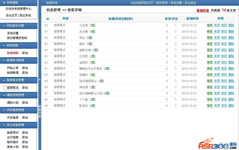 深山旅行社网站管理系统采用asp+access数据结构,使用方便,无需安装,放到服务器空间即可使用。功能介绍:网站基本设置,修改管理员密码,新闻资讯管理网站公告,旅游新闻,旅游景点,管理旅游景点,酒店宾馆管理,酒店介绍,旅游线路,管理旅游常识,出行指南,租车提示,美食介绍。