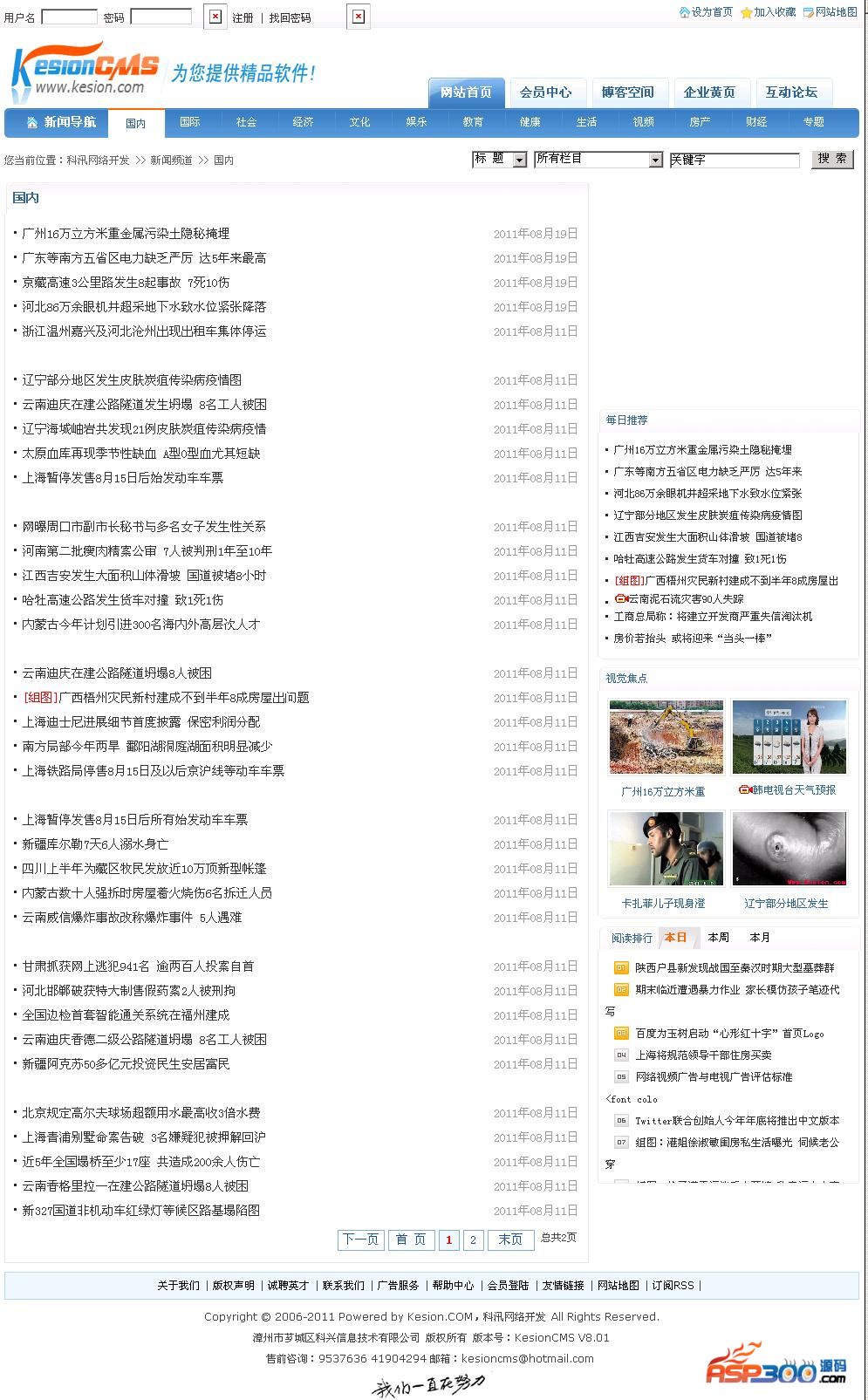 KesionCMS是漳州科兴信息技术有限公司开发的一套万能建站产品,是CMS行业最流行的网站建设解决方案之一,V9.0采用ASP+ACCESS/MSSQL架构,系统具有极强的可扩展性,并且一直以来完全开放源代码;这套系统自2006年发布的第一个版来以来,以其简单易用、功能强大、拓展性极灵活而倍受广大用户的青睐,至今已累计数十万的用户群。拥有CMS业界最全的功能,是适合任何网站的最佳解决方案功能模型十分齐全,系统拥有CMS业界最全的功能,含文章、图片、下载、商城、供求、人才、动漫、微博、影视、考试、团购、房产、问答、论坛、会员、博客空间、黄页、产品库、专题等十几个主系统和采集、调查、评论、搜索、公告、PK、心情指数、顶客DIGG、签收等几十项子系统组合而成,代码完全开源化,在尊重版权的前提下能极大的满足站长对于网站程序进行二次开发,以满足任意网站的任何需求;系统采用模型拓展,用户可以根据网站的需要,自行在后台通过自定义模型和字段来实现各种网站的功能需求,通过自定义表单实现在线报修,报名,在线反馈等系统;系统在安全性、稳定性、易用性方面具有较高的声誉,深受广大站长推崇,其灵活的产品架构、极强的可扩展性和可伸缩性完全能最大化满足站长目前及今后的应用需求人性化的管理操作平台,灵活的模板标签管理人性化的管理操作平台和灵活的模板标签管理,倍受广大用户的喜爱,系统将前台的模板和标签分离,全面支持table和div+css,让模板制作更加灵活,不局限于某种风格,随心所欲的DIY,让您的网站页面可以随时更换风格随时更改布局,万能标签让您实现各式各样的网站效果,不懂代码没关系,我们还有多种标签样式可以选择,只需轻松的点点您的鼠标,一个网站就做好了。栏目无限级分类并支持绑定顶级或二级域名系统支持栏目无限级分类,并可对系统栏目进行一级或N级栏目的排序操作,对栏目之间的内容进行复制(CTRL+C),粘贴(CTRL+V)操作,对栏目的内容进行合并,对栏目或文章进行批量的绑定模板或设置文章的属性,点击次数等; 另外新版中栏目支持绑定顶级或二级域名,满足为了方便用户记忆或便于SEO或者大型网站的需要。强大的搜索引擎(SEO),自定义生成路径系统支持动态asp,伪静态(带组件和不带组件),全静态三种生成方式,并且可以自定义生成的Html路径,方便自己做SEO,用户可以根据网站的需求随意选择。无处不在的SNS互动元素,让您的爱站更具交流互动性在这个日新月异的网络时代,KesionCMS始终以用户体验为导向,在本次V8.0版本中,融入更多的SNS。博客日志管理功能、相册管理功能、朋友圈管理功能、群组讨论管理功能、新鲜事、网友动态、最近谁来看过我、空间留言、日志评论、RSS在线订阅管理功能、收藏夹管理功能、邮件群发功能、短消息服务等实用功能;无处不在的SNS互动元素,让您的爱站帮助所有用户在浏览您的网站时更好的交流互动。灵活的商业运营模式,完善的用户权限分配系统和资金明细KesionCMS系统拥有一套健全完善的会员体系和完整的支付平台接口。可以在后台自由设置会员组,可以对栏目和文章设置会员浏览时权限及查阅所需消耗的科汛币金额;会员在会员中心可以在线充值或购买点卡进行充值;另外,网站的管理员在后台可以详细的查看资金明细,用户在前台会员中心也有详细的资金明细表。这样一来,网站可以通过销售点券,积分,充值卡,资金等来进行盈利。打破传统CMS系统瓶颈,系统自带功能强大的论坛BBSKesionCMS打破CMS系统瓶颈,系统自带功能强大的BBS,不再为了整合第三方论坛平台而烦恼,一站式用户登录,系统还集成腾讯QQ,新浪微博及支付宝快捷登录,只需绑定下帐户,以后可以直接用QQ号或支付宝帐户登录。论坛拥有大型论坛的功能,可自定义版面分类、版规说明、版主分配、权限分配、设置积分和威望、论坛等级头衔设置,还可以将版面设置为认证版面,只有特定权限的用户才能进入认证版面发帖。发表主题后,可以只看该作者及查看该作者发表的主题;可以在会员中心查看自己发表的主题;可以对用户帖子进行点评,回复,还可对精典的帖子内容进行置顶,加精等操作。