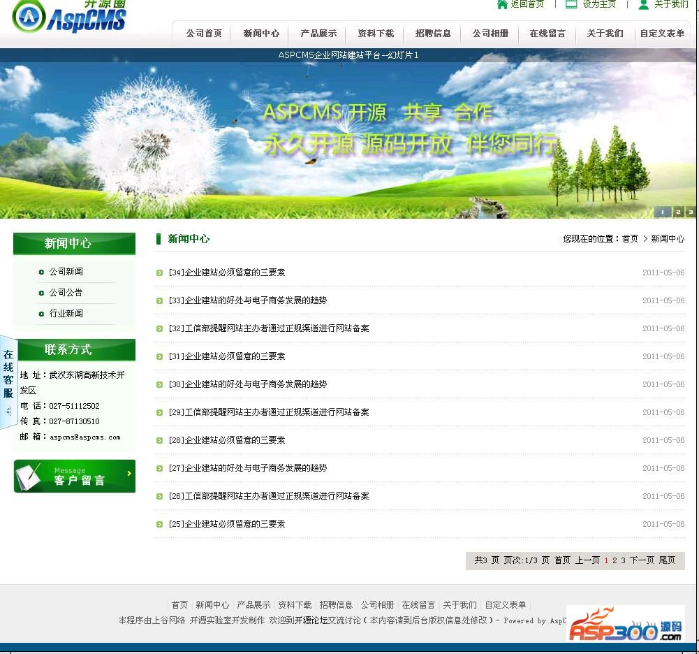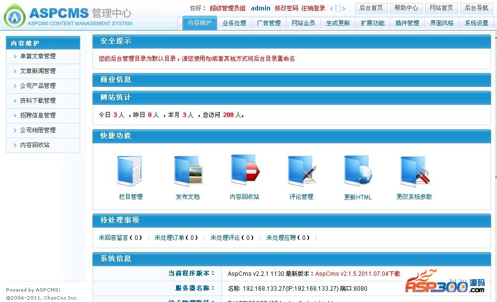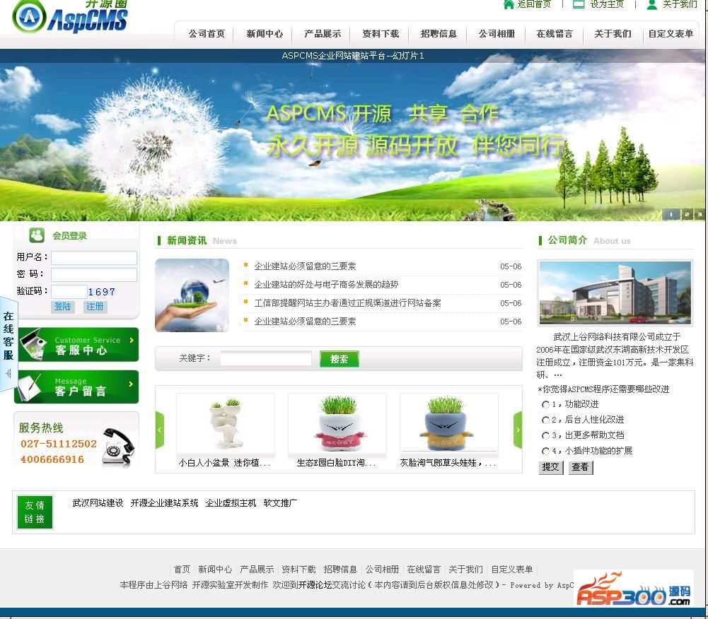 ASPCMS是由武汉上谷网络科技有限公司开发并完全开放源码的一套企业网站管理系统,主要面向企业进行快速的建造简洁,高效,易用,安全的公司企业网站,一般的开发人员就能够使用本系统以最低的成本、最少的人力投入在最短的时间内架设一个功能齐全、性能优异的公司企业网站。