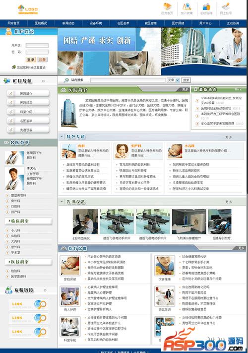 1、网站首页 – 预设医院简介、最新动态、名医荟萃、特色专科介绍、科室导航、先进设备展示、医疗保健知识等版块,可以任意修改排版布局设置显示内容。