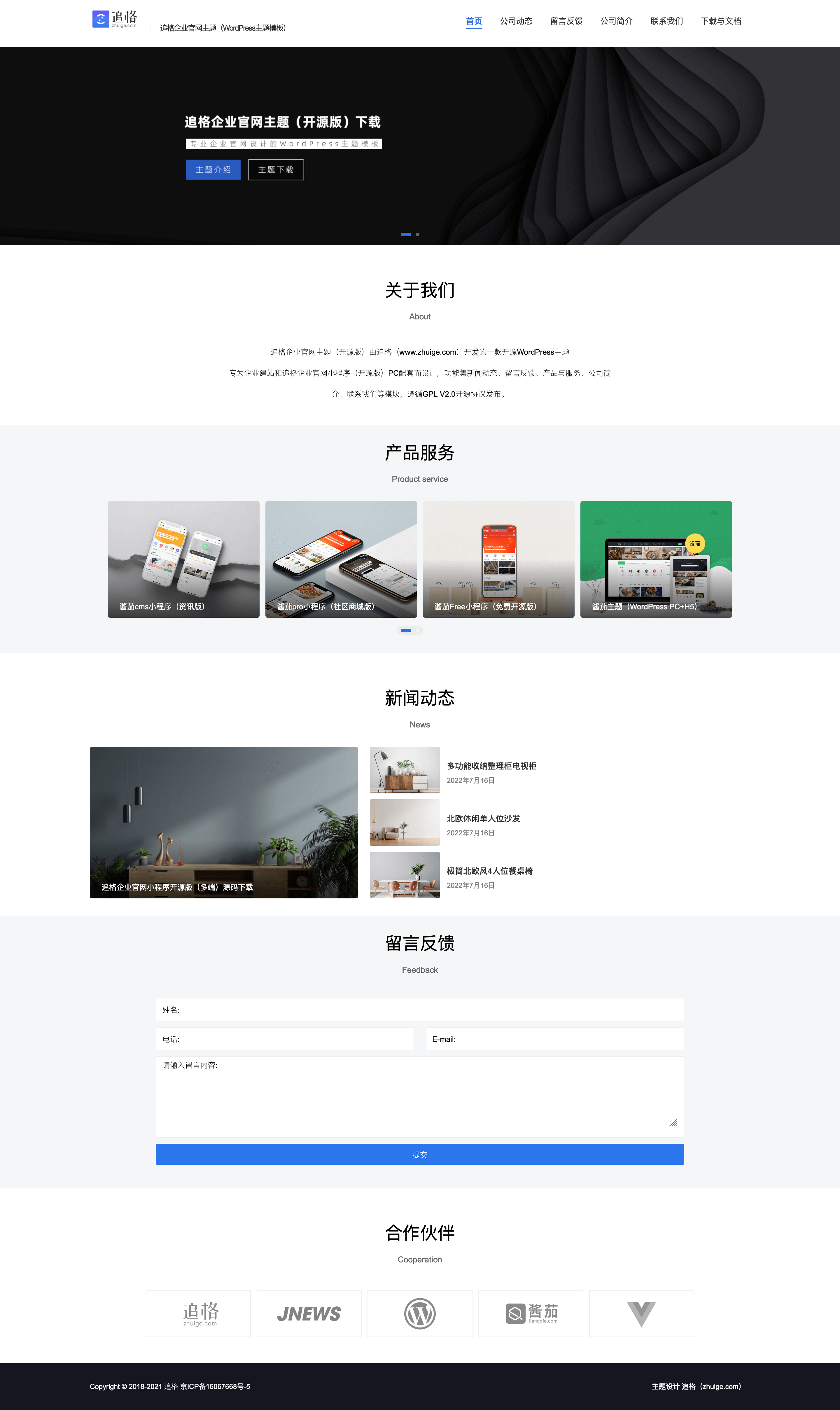 追格企业官网主题(开源版)由追格开发的一款开源WordPress主题,专为企业建站和追格企业官网小程序(开源版)PC配套而设计,功能集新闻动态、留言反馈、产品与服务、公司简介、联系我们等模块,遵循GPL V2.0开源协议发布。