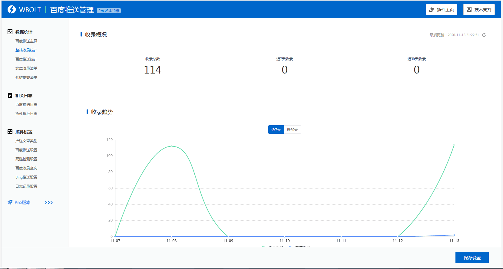 整站收录统计-支持快速查看网站的收录总数、最近7天收录及最近30天收录数据概况,及最近7天&30天的收录趋势折线图。