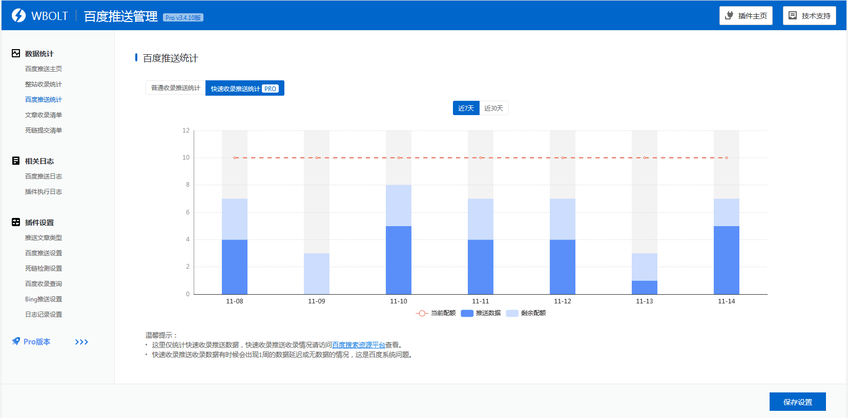 百度推送统计-支持快速查看百度搜索资源平台普通收录及快速收录推送最近7天&30天的推送数据走势。