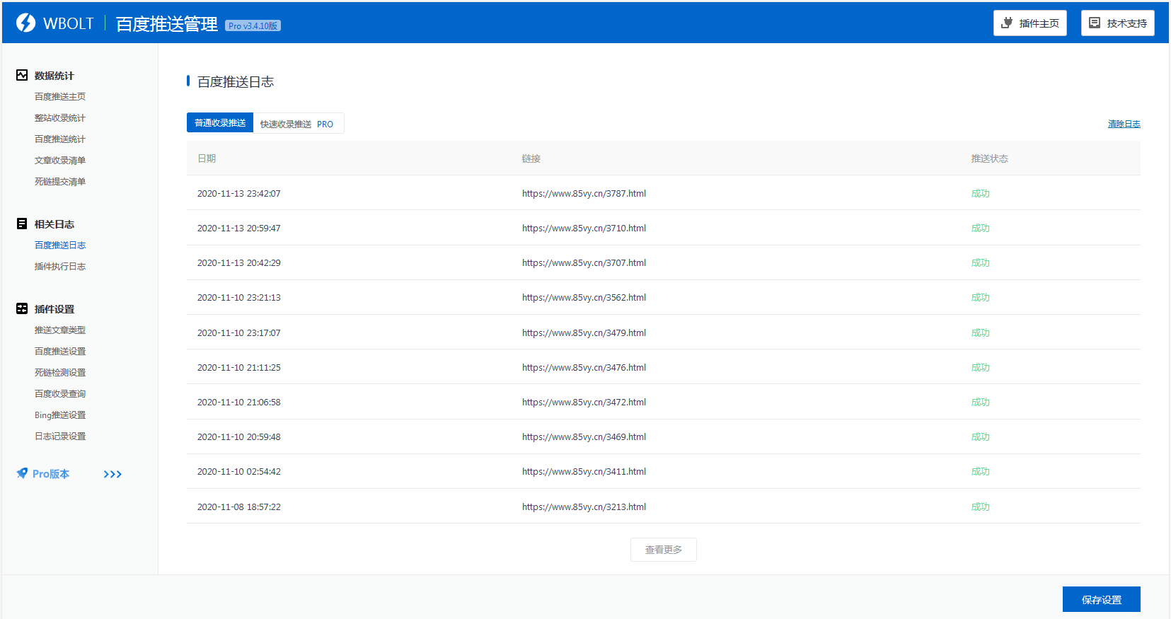 Bing推送日志-支持查看Bing手动推送及自动推送相关日志,日志列表包括推送日期、推送链接及推送状态,并支持一键清除日志。
