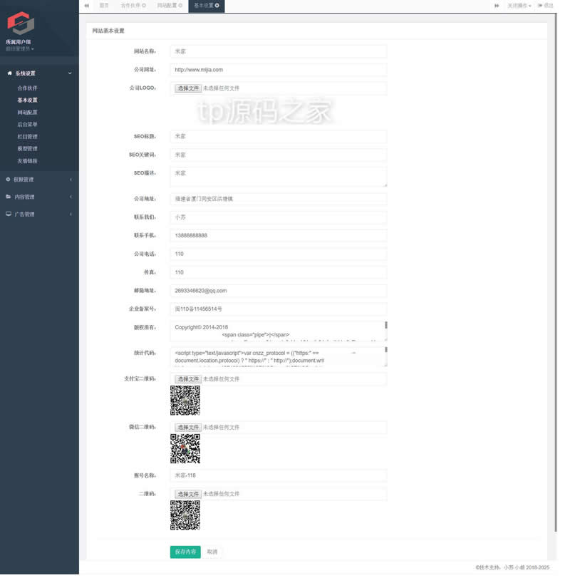 源码是由thinkphp5内核开发,系统包括 系统设置 – 权限管理 – 内容管理 – 广告管理等功能等。