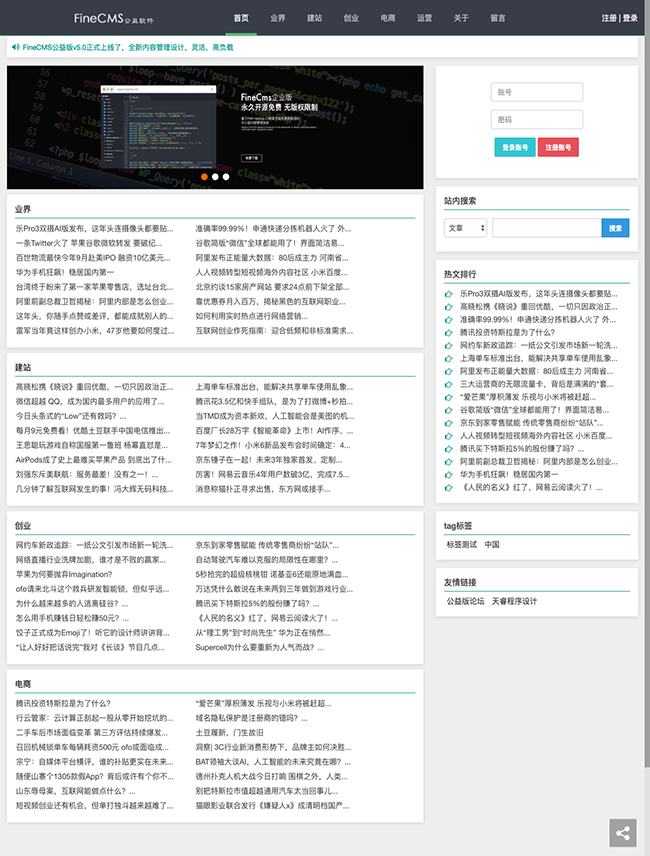 FineCMS企业网站管理系统(简称免费版或企业版)是一款基于PHP+MySql+CI框架开发的高效简洁的中小型内容管理系统,面向多终端包括Pc端网页和移动端网页,支持自定义内容模型和会员模型,并且可以自定义字段,可面向中小型站点提供重量级网站建设解决方案,适用于小型站点、企业级网站、新闻内容网站等,个人站长及中小企业的首选建站系统。