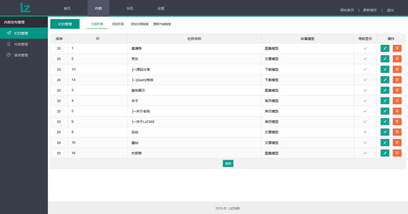 1、内容模型有:单页模型、文章模型、链接模型、图集模型、下载模型。