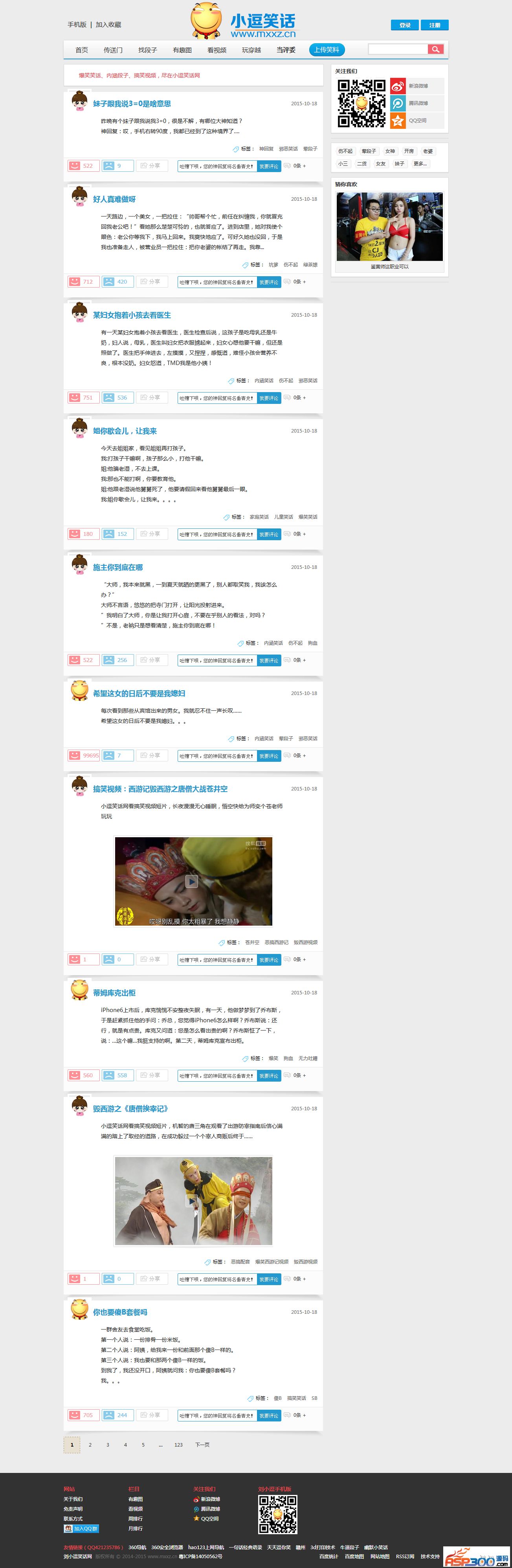 小逗笑话,本源码是基于ThinkPHP框架开发的开源程序Loowei笑话程序的笑话分享类网站模板,借鉴嘻嘻哈哈并结合自己的个人用户体验经验开发,本次分享只包括模板文件,原程序版权归Loowei作者所有。由于是开源程序,所以没有经过作者同意,打包原主程序和模板分享给需要的站长朋友们。