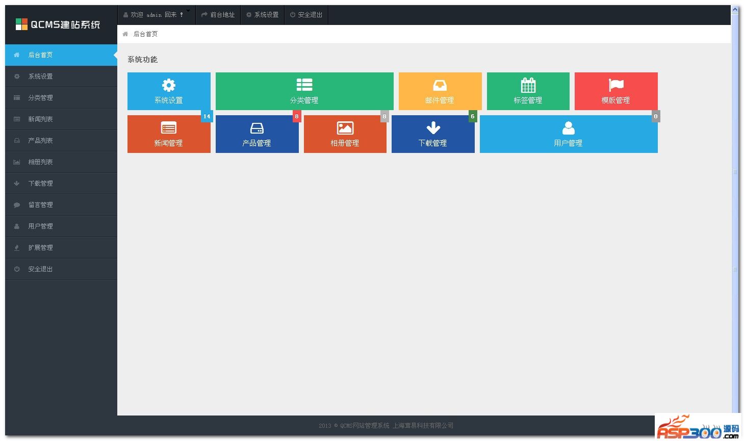 QCMS 网站管理系统 是通过MVC架构开发的一套PHP轻量级系统,它免费,开源,小巧,易用,功能强大. 可以自定义模块, 容易二次开发, 可以称得上是万能CMS系统, 可用于企业站,文章站,图片站,下载站,你只要能想得到,就能做的到.QCMS 网站管理系统 功能介绍:1. 核心设置 后台可以设置网站标题,网站简介,统计, 伪静态, 时区,语言, 所使用的风格,等等;2. 多语功能 通过语言包和模板可以实现多语版.3. 会员模块 支持会员注册,登录, 会员可以发表文章,管理文章,会员可以充值, 通过支付插件可以实现在线购物.建立商城功能.4. 栏目管理 可以创建无限级分类的栏目,以及各栏目功能设置,新建栏目可以选择万能模块创建的各种模块,实现各种需求; 每个栏目可以指定不同的模板.5. 模板及标签 模板全面标签化,懂得html就可以很快做出一套QCMS模板. 模板可在后台管理并编辑,无需FTP上传.6. 后台管理组 可以添加后台管理员及网站编辑等,并可以设置各级管理员的操作权限;7. 万能自定义模块 此功能是本系统的一个亮点,系统自带一个文章模块, 除了这个模块外,用户可以通过建立模块和自定义字段,建立任何你所需要的模块, 比如下载, 商城, 视频等等.已实现了字段类型有:文本、下拉菜单、单选、复选、图片、下载、单图,等. 使用网站功能满足客户各种需求;8. 万能自定义表单功能 通过增加自定义字段自动生成各种表单, 将此代码粘贴到前台模板中, 可以实现在线留言,在线报名,在线调查,等栏目.9. 数据库备份还原功能 通过此功能可以定期进行网站数据备份还原,保证网站的数据不受损失。10. 自定义页面 可通过后台添加自定义标签,页面,js,xml11. 插件平台 插件机制和平台已创建好,官方会定期发布一些插件供大家下载.安装. 通过插件可以实现更多个性化的功能. 比如友情链接,支付宝插件, 地图接口,12. 高效缓存功能 开启缓存后,打开的网站速度如同静态页一样流畅.