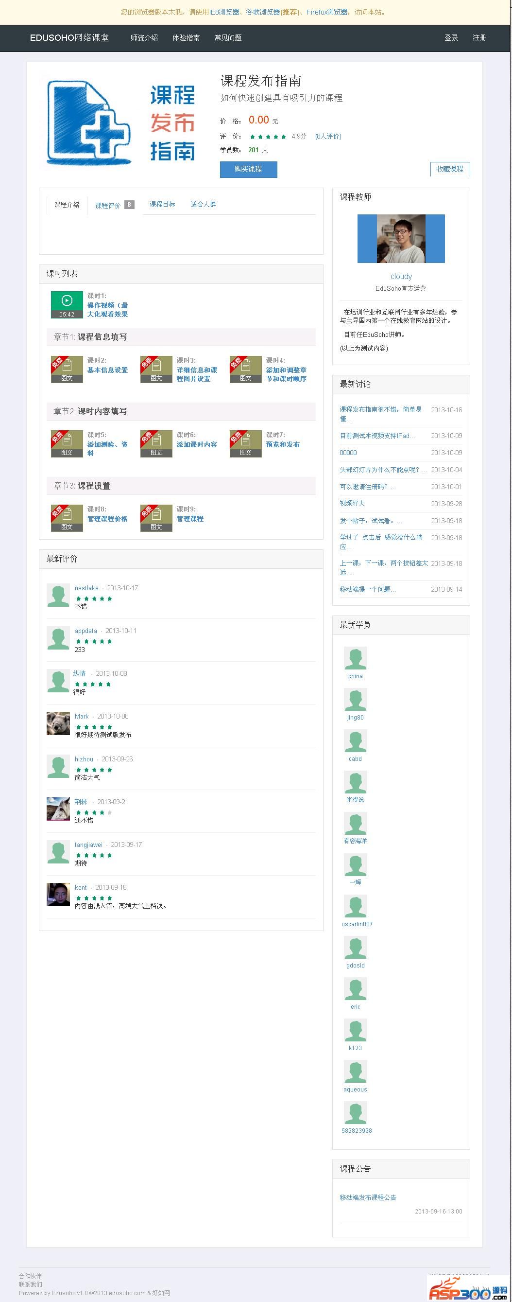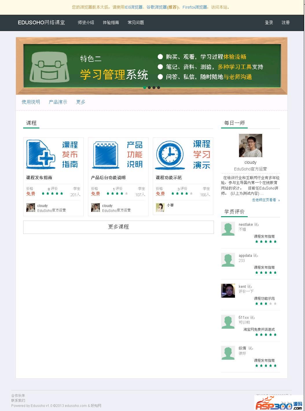 EduSoho”是一个开源的在线教育网站建站系统,采用全新的互联网的设计思路,将线上支付,线上教学,线上学习,线上讨论反馈融为一体,更增加web2.0元素,如个人主页,关注体系,让在线教育更具有粘性,让学员更易使用。不仅如此,EduSoho更有完整的网站管理功能,让客户轻松进行网站管理、教学管理。