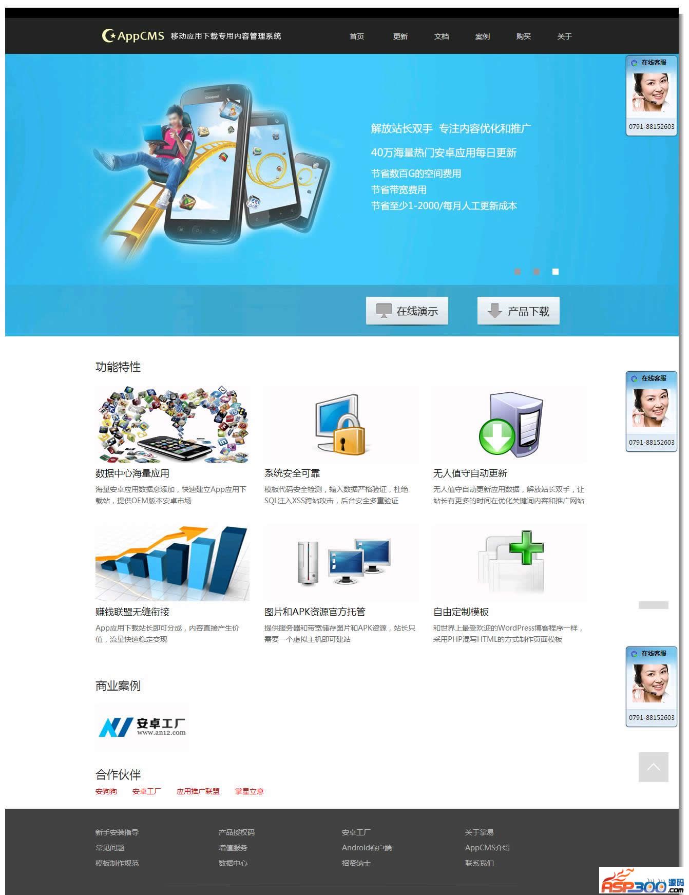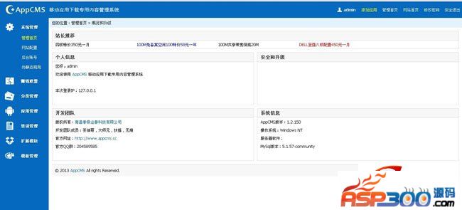 AppCMS安卓CMS网站系统 v1.4.235 更新日志:1,新增伪静态标签,利于SEO优化。伪静态标签输入weixin前台伪静态页面就变成 http://www.****.com/app/weixin.htm。2,二维码接口修改,由google接口修改为联图接口。老用户升级请看升级包内的升级说明。3,修正nginx.conf错误。4,修正默认模板部分链接错误。5,安卓市场手机客户端(至尊版OEM)版本更新至1.0.75。6,去掉了本地添加应用的授权限制,免费版也可以添加本地应用。7,修复其他BUG
